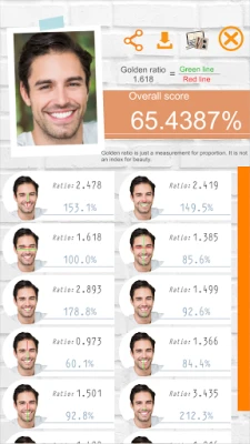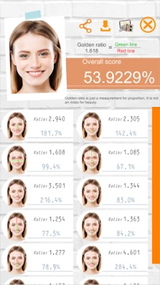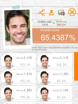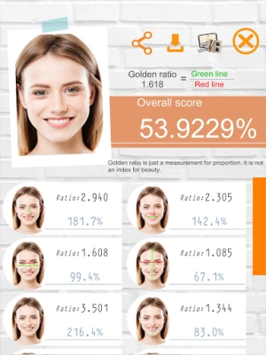 - **Precision Measurements**: Calculates 12 key facial ratios against the ideal golden ratio of 1.618 (the perfect proportion). - **Visual Reports**: Understand your proportions with easy-to-read green and red lines indicating measurements. - **Score System**: Receive an overall percentage score reflecting how close your features are to the golden ratio. - **Beauty Beyond Numbers**: Remember, the golden ratio is a measure of proportion, not beauty. Everyone is uniquely attractive!