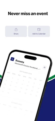 NEVER MISS AN EVENT The event section shows a list of events throughout the district. Users can add an event to their calendar and share the event with friends and family with one tap.